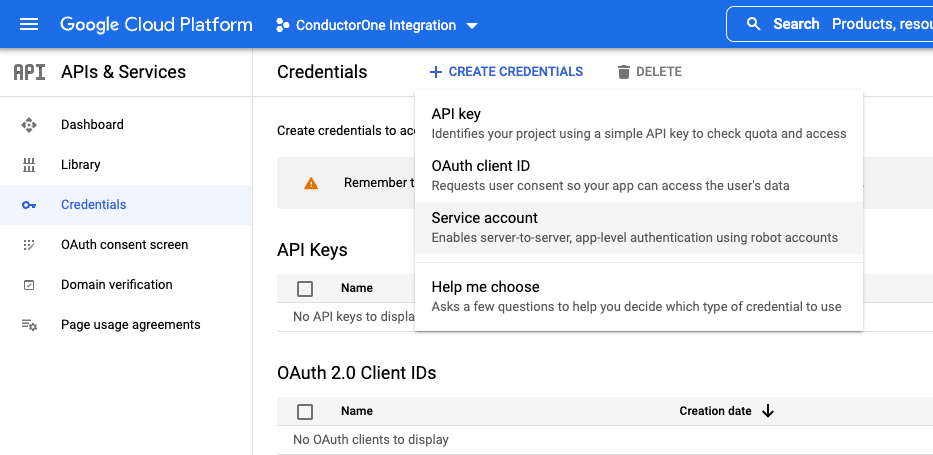 Select CREATE CREDENTIALS > Service Account.