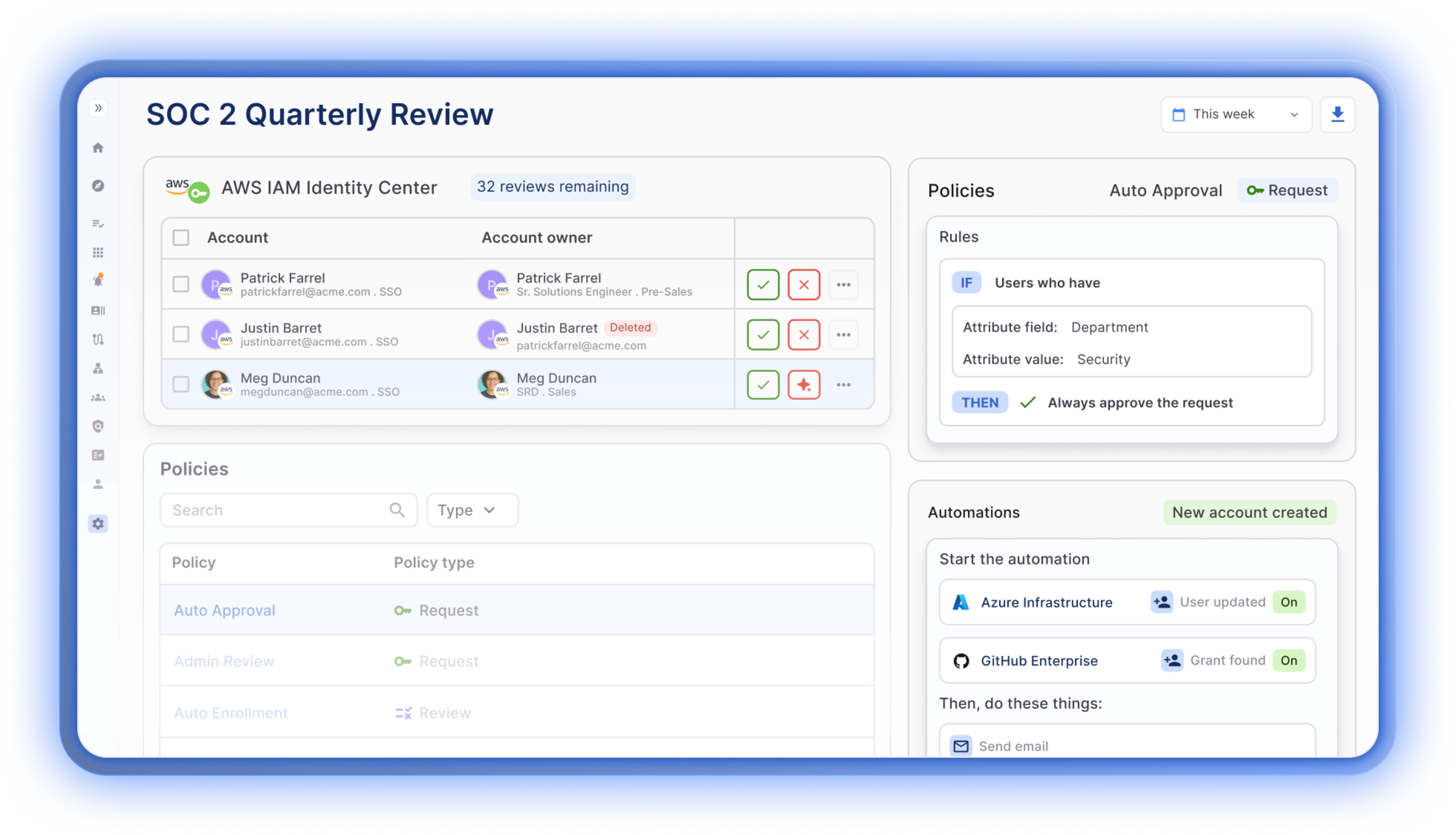 - Compliance Alignment. Support for SOX, SOC 2, HIPAA, PCI, and other frameworks helps organizations meet regulatory requirements through automated reviews, evidence collection, and audit reporting.
